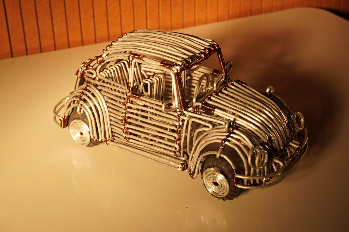 Unsere Drahtkunstmodelle sind kleine Meisterwerke: Autos, Fahrräder oder Flugzeuge und vieles mehr – mit feinen Details wie z.B. beweglichen Türen, alle liebevoll von Hand gefertigt aus Aluminium- und Kupferdraht in Kinshasa.